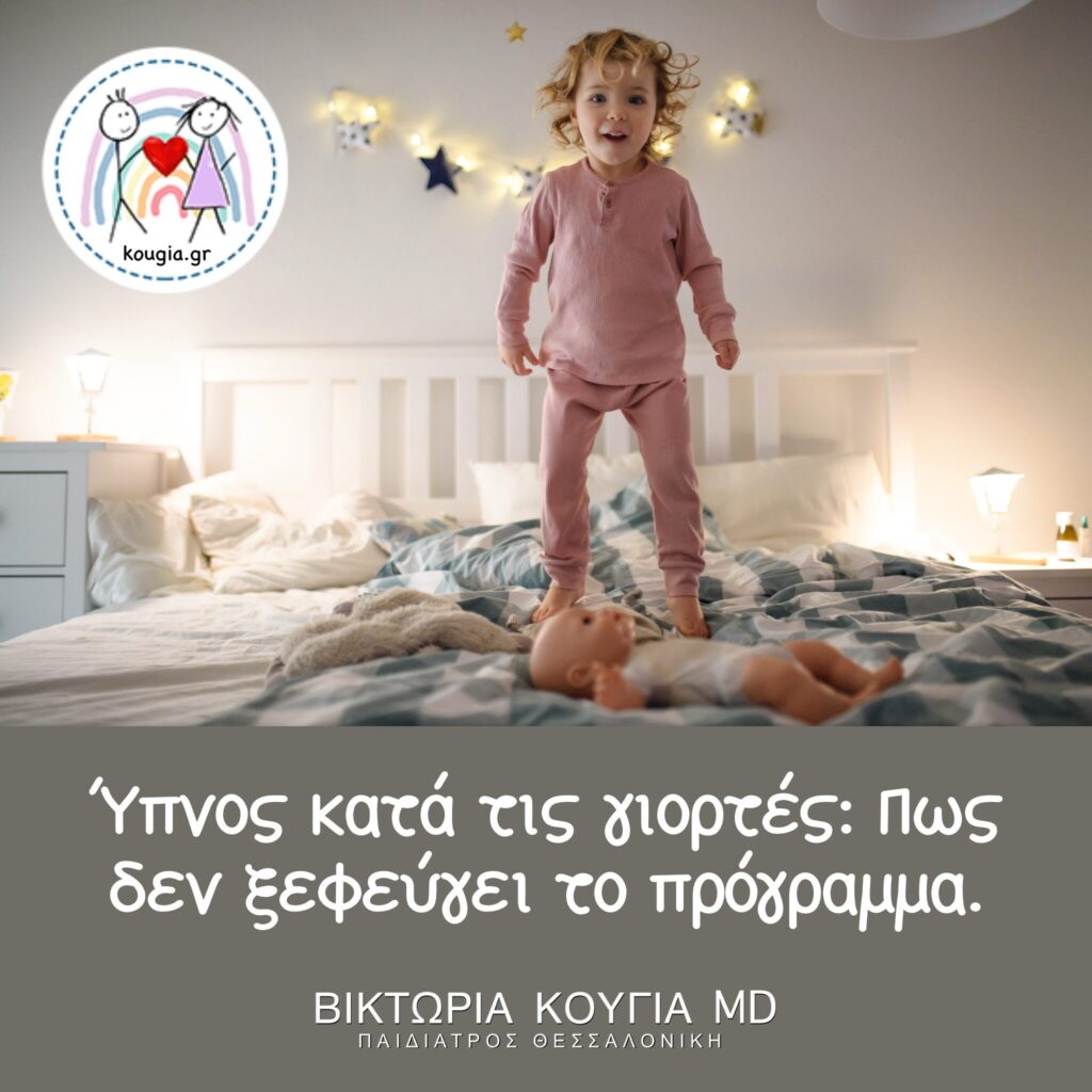 Οι επισκέψεις, τα φώτα και ο ενθουσιασμός μπορούν να απορρυθμίσουν τον ύπνο — ειδικά σε παιδιά 0–6 ετών.